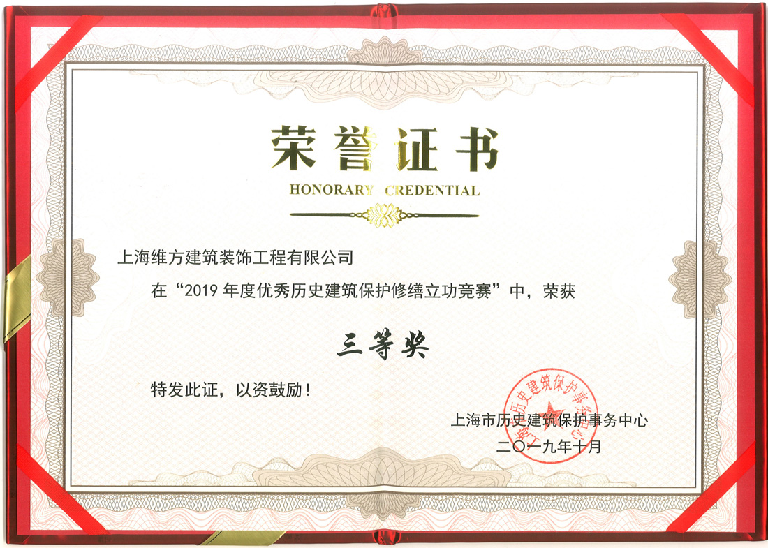 公司取得上海市2019年度優(yōu)秀歷史建筑保護修繕立功競賽三等獎