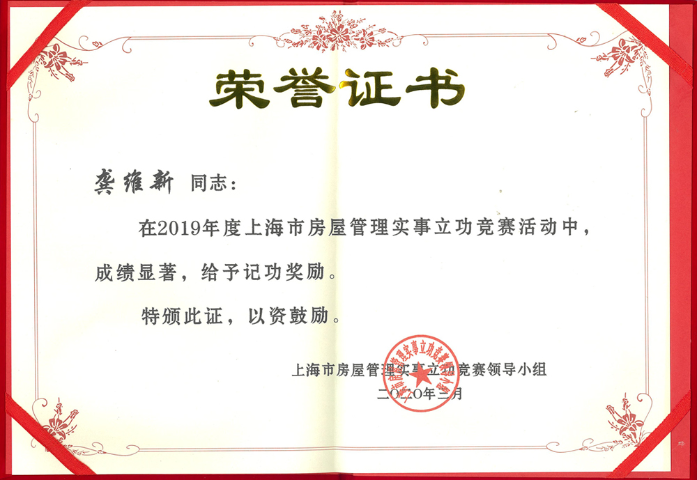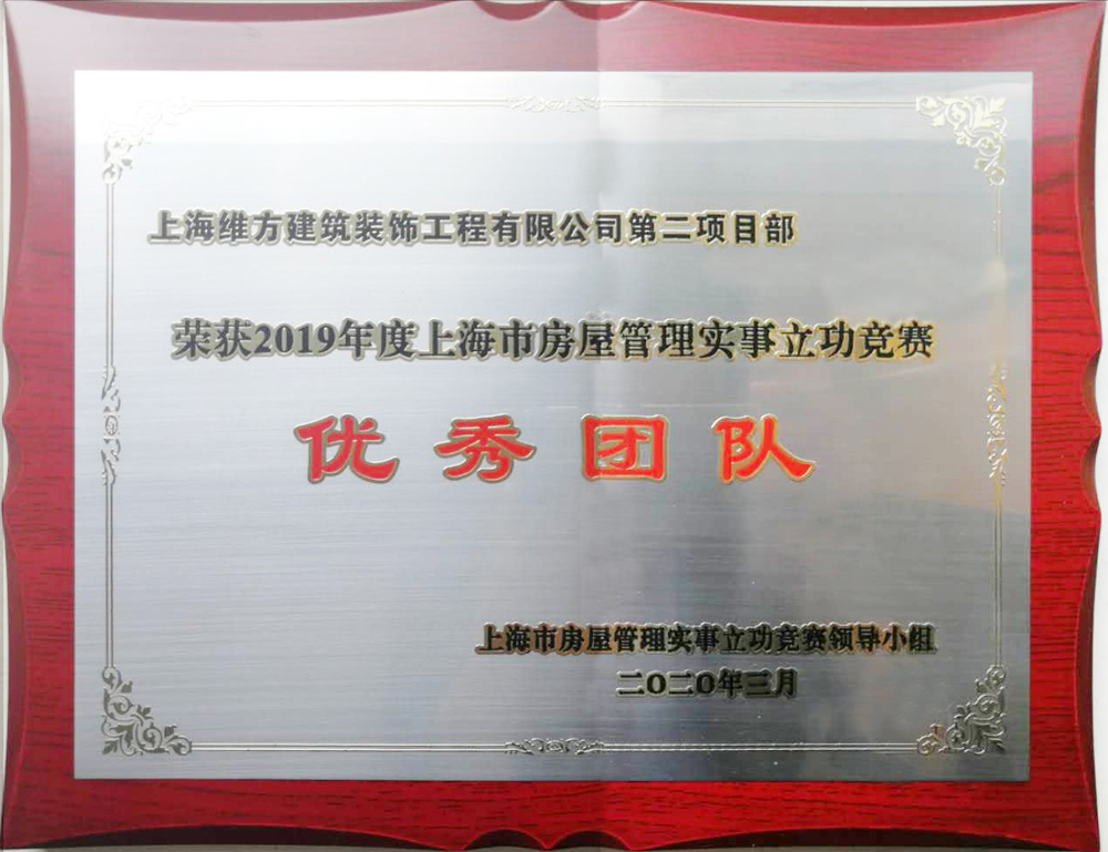上海維方建筑裝飾工程有限公司第二項(xiàng)目部獲評2019年度上海市房屋管理事實(shí)立功競賽城市更新分賽區(qū)優(yōu)秀團(tuán)隊(duì)稱號,公司總經(jīng)理獲評記功個(gè)人。